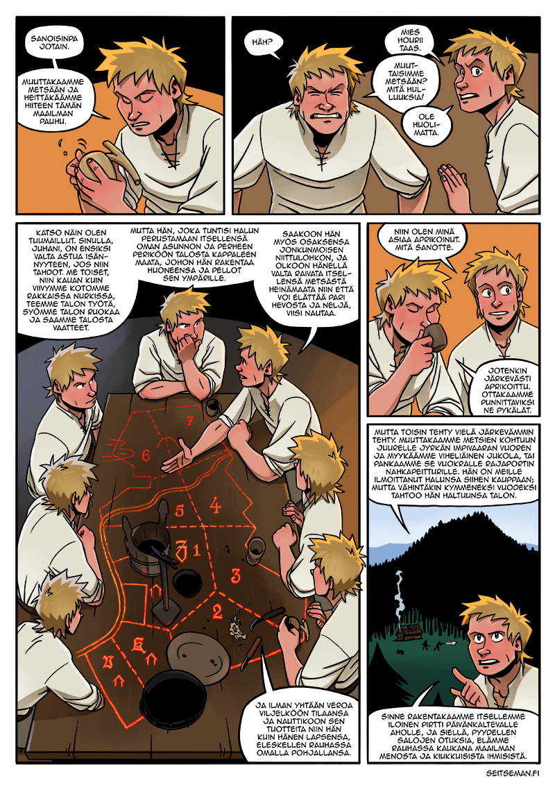Pöydällä kuvattuna kartta Jukolan maista: yläosassa sijaitsee Ilvesjärvi ja Impivaara, keskipaikkeilla läpi kulkee maantie, alavasemmalla Kekkurin ja Vuohenkalman torpat. Maat jaettuna Aapon kaavailemasti seitsemään osaan, jossa Jukola sijaitsee ykköstontilla.